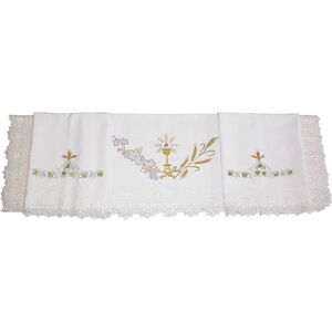 Vista previa: MANTEL DE ALTAR BORDADO EN HILO DORADO Y COLOR CON PUNTILLA (3X1,5MT)